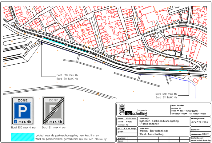 Dit door het plaatsen van de borden RVV E10 (max 4 h) en bord RVV E11 (max 4 h) en het aanbrengen van blauwe belijning zoals aangegeven op tekening 377319-003.