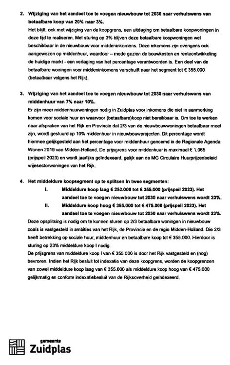 Op grond van het addendum bij de woonvisie uit oktober 2023, streeft Zuidplas ernaar om 36% van de toe te voegen nieuwbouw tot 2030 in het middeldure huursegment (10%), of het koopsegment tot aan de landelijke betaalbaarheidsgrens (26%) te programmeren. In combinatie met 30% sociale huur, sluiten deze streefpercentages goed aan bij de ambitie van het Rijk om twee derde van de totale woningbouwproductie in het betaalbare segment te realiseren.