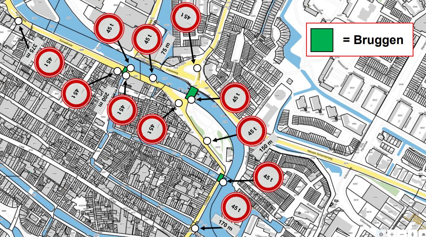 Uit het onderzoek van Stadswerk072 is gebleken dat drie bruggen in het centrum van Alkmaar – te weten de Rotorenbrug, Friesebrug en Bokkebrug – een maximale toelaatbare belasting hebben van 45 ton. Voor deze bruggen geldt derhalve een aslastbeperking. Verkeer met een gewicht hoger dan 45 ton vormt een risico voor het behoud en de veiligheid van deze bruggen.
