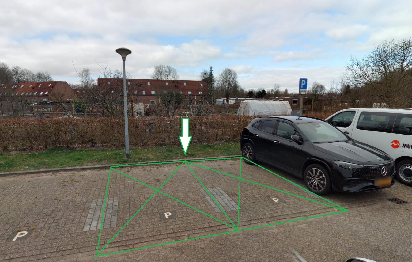 De parkeerplaatsen zijn alleen bedoeld voor het opladen van elektrische auto’s. Daarom plaatsen we het verkeersbord E08c (dit staat in bijlage I van het RVV 1990). We plaatsen ook het verkeersbord OB504 daaronder. Dit is een bord met twee pijlen die wijzen naar de parkeerplaatsen.