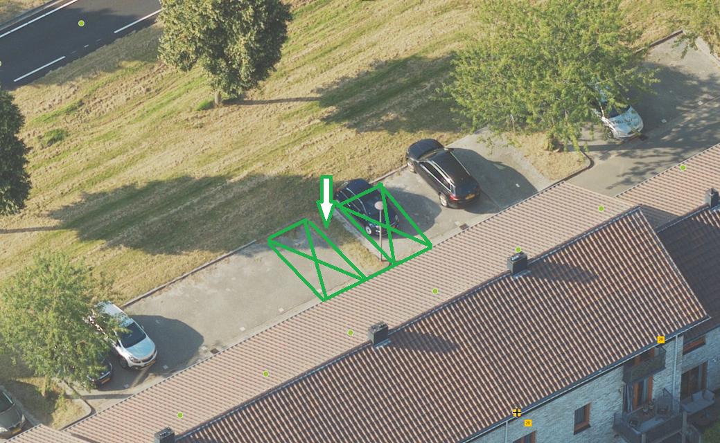 De parkeerplaatsen zijn alleen bedoeld voor het opladen van elektrische auto’s. Daarom plaatsen we het verkeersbord E08c (dit staat in bijlage I van het RVV 1990). We plaatsen ook het verkeersbord OB504 daaronder. Dit is een bord met twee pijlen die wijzen naar de parkeerplaatsen.