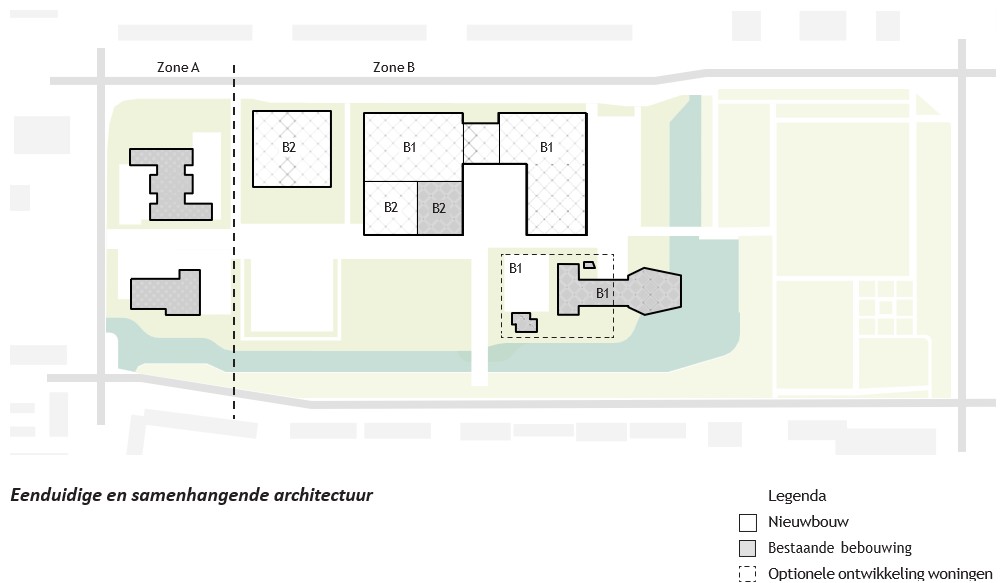 Vanwege de uitzonderlijke schaal, positie en programmering van de nieuwe gebouwen ten opzichte van de omliggende woningbouw heeft het nieuwe programma een bepaalde mate van architectonische vrijheid. Er is niet direct aanleiding voor een architectonische samenhang (materiaal en kleur) tussen de nieuwe gebouwen en de omliggende bestaande woningbouw. Daarbij moet het echter wel rekening houden met de omgeving en geen sterke dissonant zijn.