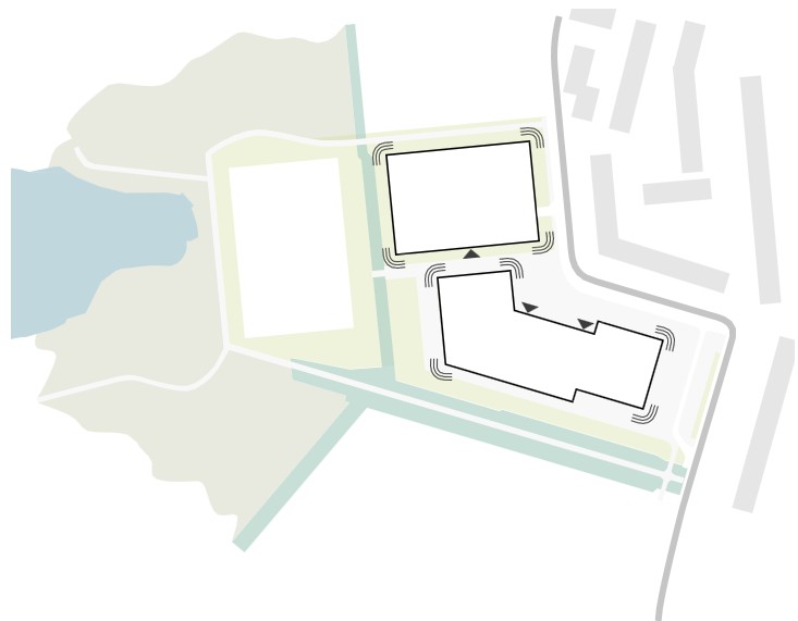 De hoofdentrees aan de hoofdstructuur zijn herkenbaar. De plaatsing van de (hoofd) entrees is cruciaal voor de logistiek vanuit aanloop- en fietsroutes uit de omgeving. Dit geldt zowel voor het schoolgebouw als het gebouw met sportvoorzieningen waaronder een belangrijk deel van het parkeren gehuisvest is. De (hoofd)entrees spelen tevens een belangrijke rol in de leesbaarheid van de samenhang van de verschillende bouwvolumes en interne functies. De entrees worden dusdanig vormgegeven dat deze duidelijk herkenbaar en uitnodigend zijn.