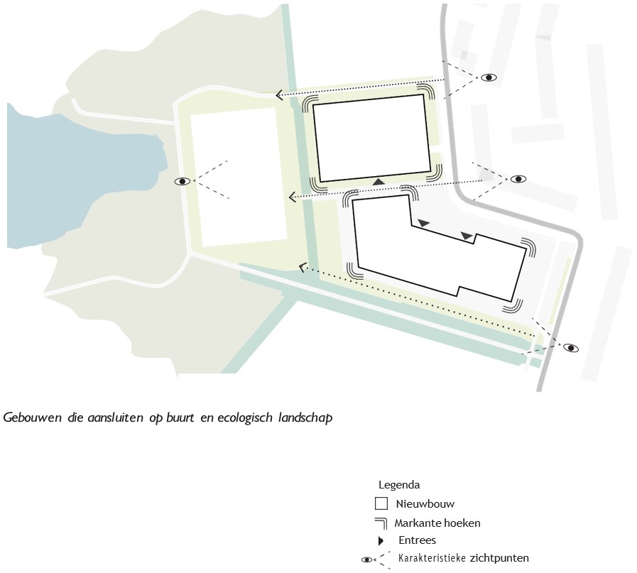 Het project kent “twee gezichten”, een gezicht naar het ecologische landschap en een gezicht naar de buurt. Deze context dient nadrukkelijk in de uitwerking van het project zichtbaar te worden. Niet letterlijk in de uitwerking van “twee gezichten” in de architectuur. Maar het project dient wel te reageren op de omgeving. De gebouwen kunnen bijvoorbeeld reageren op het omliggende landschap en de buurt doormiddel van (gebouw) morfologie, materiaalgebruik, kleur en verhouding open/gesloten (binnen buiten relatie).