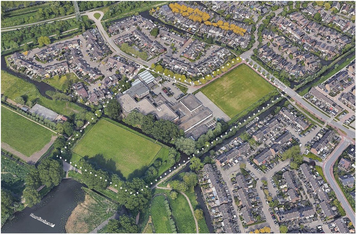De ruimte tussen het gebouw met sport- en parkeervoorzieningen en de school dient een visuele en landschappelijke verbinding te vormen tussen de Vijzellaan en de Noordhoekse Wiel. De gevels die deze ruimte begeleiden, dienen deze verbinding passend vorm te geven door middel van bijvoorbeeld groene gevels, sprongen in de massa-opbouw en/of een bijzondere detaillering van de gevel.