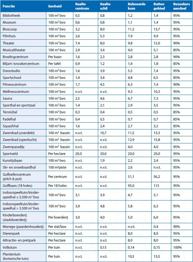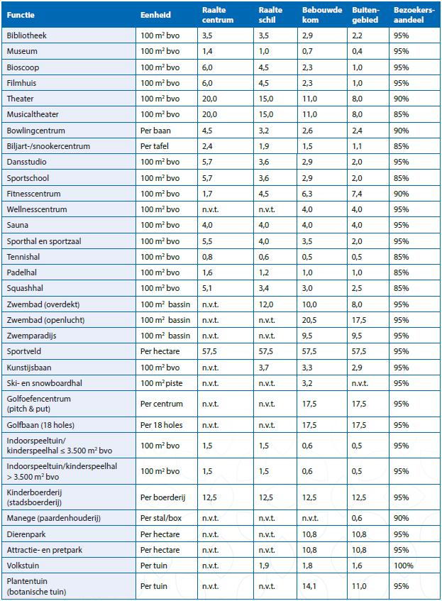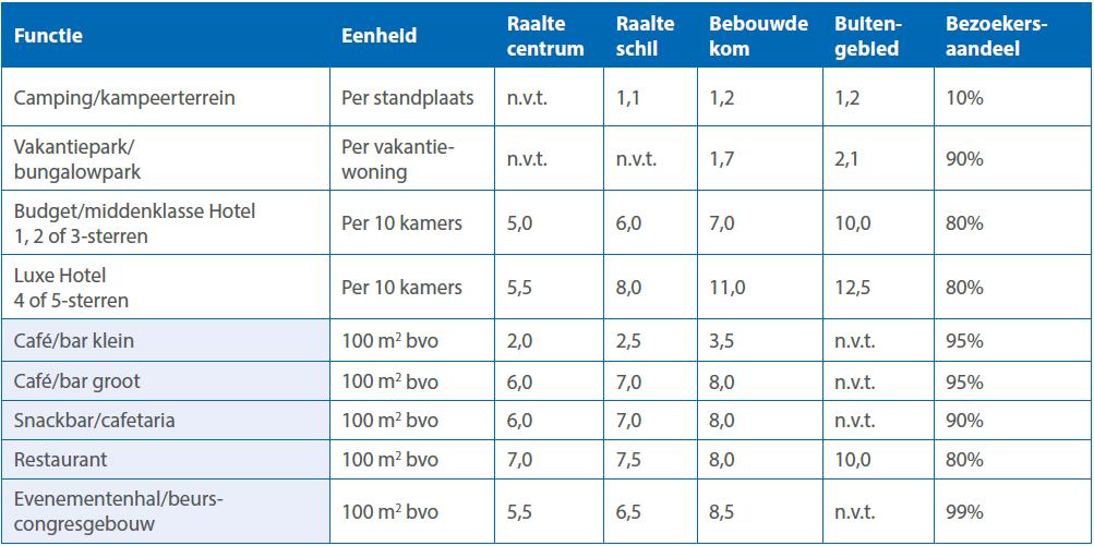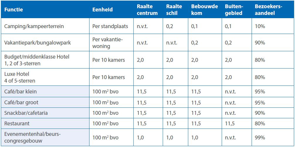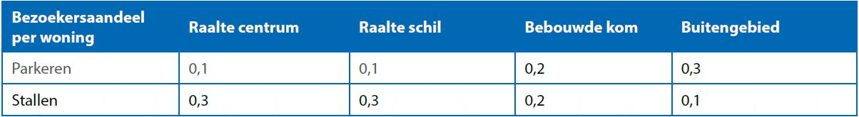 Het bezoekersaandeel betreft parkgasten. Het overige deel (10%) betreft personeel en bezoekers van gasten. Wanneer op het park een restaurant (of een andere voorziening) is die ook publiek toegankelijk is (voor externe gasten), is daarvoor een maatwerkonderbouwing nodig voor de parkeer- en stallingsbehoefte.