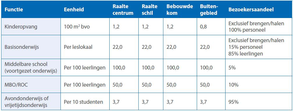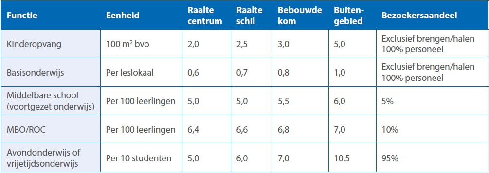 Een middelbare school heeft een bovenlokaal verzorgingsgebied. Het aantal benodigde parkeer- en stallingsplaatsen varieert per locatie, daarom is een maatwerkonderbouwing vereist. De normen geven een indicatie voor personeel, leerlingen en incidentele bezoekers (zoals ouders bij korte gesprekken of incidenteel brengen/halen). Parkeerplaatsen voor bezoekers en personeel kunnen in de regel dubbelgebruikt worden. De parkeer- en stallingsbehoefte bij open dagen is niet meegenomen.