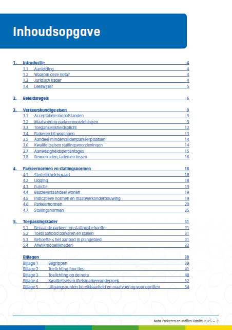 Na een korte introductie, hieraan voorafgaand in hoofdstuk 1. Introductie volgt de overstap naar de inhoudelijke beleidsregels in hoofdstuk 2. Beleidsregels. De beleidsregels vormen de basis voor het berekenen van de parkeer- of stallingseis die van toepassing is op alle ruimtelijke initiatieven. De daarbij te hanteren verkeerskundige eisen zijn opgenomen in hoofdstuk 3. Verkeerskundige eisen. Aspecten als bereikbaarheid en maatvoering worden hierin beschreven. De parkeer- en stallingsnormen zijn weergegeven in hoofdstuk 4. Parkeernormen en stallingsnormen. Het toepassingskader in hoofdstuk 5. Toepassingskader omschrijft hoe de regels, eisen en normen moeten worden toegepast. Belangrijk onderdeel hiervan is paragraaf 5.4 Afwijkmogelijkheden waarin een reeks afwijkmogelijkheden staan omschreven. Voor achtergrondinformatie is een aantal bijlagen opgenomen.