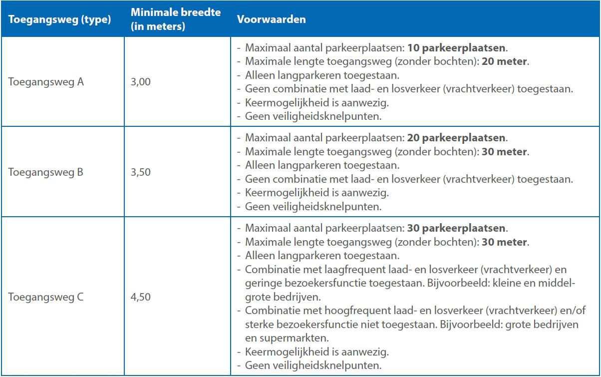 Toegangswegen vormen de verbinding tussen de openbare weg en de parkeerweg. Idealiter voldoen toegangswegen aan de meest recente CROW-richtlijnen waaronder, ‘ASVV2021’. In sommige situaties kan sprake zijn van een smalle(re) toegangsweg naar private parkeerterreinen en/of bedrijfspercelen. Deze toegangswegen moeten voldoende breed zijn voor een minimale verkeersafwikkeling en voldoen aan de voorwaarden voor een uitzonderlijk smalle toegangsweg. De toegangsweg dient te voldoen aan álle voorwaarden en maatvoering zoals opgenomen in tabel 4, als de toegangsweg daaraan niet voldoet of slechts gedeeltelijk, worden de parkeerplaatsen en/of bestemmingen als niet bereikbaar beschouwd. Deze gegeven (minimale) maatvoering mag enkel en alleen bij absolute uitzonderingssituaties worden toegepast.