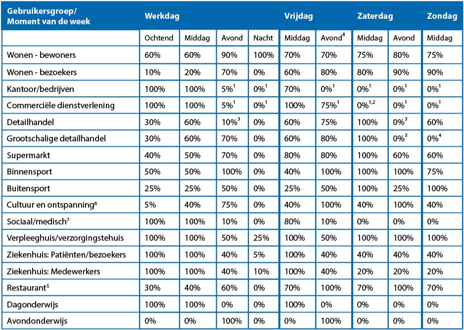 Het drukste moment van de week is het maatgevend moment voor het aantal te realiseren parkeer- en stallings-plaatsen. Het bepalen van dat drukste moment gebeurt met behulp van de aanwezigheidspercentages. Verder worden de aanwezigheidspercentages gehanteerd voor verkeerskundige berekeningen, zoals een salderingsberekening of een parkeerbalans. In onderstaande tabel 6 staan de aanwezigheidspercentages per gebruikersgroep.
