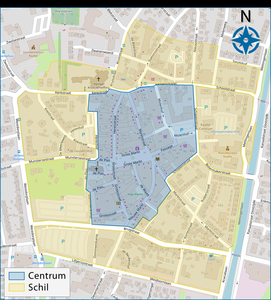 Het hoofdwinkelgebied van een dorpskern met een sterke, centrale clustering van centrumfuncties, horeca en detailhandel. Meestal gaat het om kleinschalige winkels met een bruto vloeroppervlak niet groter dan 500 m2. Deze functie is alleen van toepassing bij winkels in het centrum en schilgebied van Raalte. Voor winkels in andere dorpskernen of -delen, wijken of buurten geldt de norm ‘Winkel kernen en wijken’. Voor specifieke functies in een dorpswinkelcentrum zoals horeca of supermarkten geldt deze functie niet.