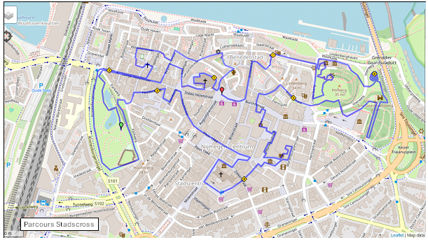 dat het stadscrossparcours onder meer via de Nonnenstraat, Lange Hezelstraat, Plein 1944, Valkhof en Grotestraat voert;