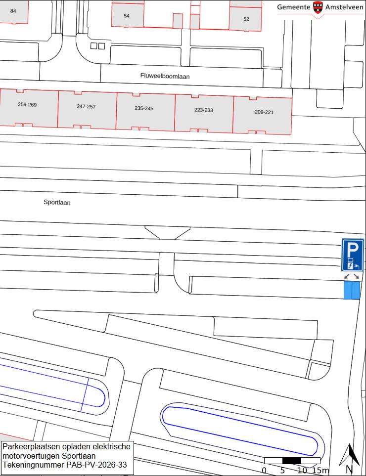 Burgemeester en wethouders van Amstelveen besluiten de locatie te wijzigen van de gereserveerde parkeerplaatsen voor het opladen van elektrische motorvoertuigen, zoals vastgesteld in het besluit van 3 augustus 2023 (zaaknummer Z23-063555), gelegen aan de Sportlaan. De huidige locatie van de gereserveerde parkeerplaatsen zijn weergegeven op de in dit besluit opgenomen tekening PAB-PV-2023-75. De openbare laadpaal is nog niet geplaatst waardoor in de praktijk niets veranderd. De nieuwe locatie van de gereserveerde parkeerplaatsen voor het opladen van elektrische motorvoertuigen zijn weergegeven op de in dit besluit opgenomen tekening PAB-PV-2026-33.