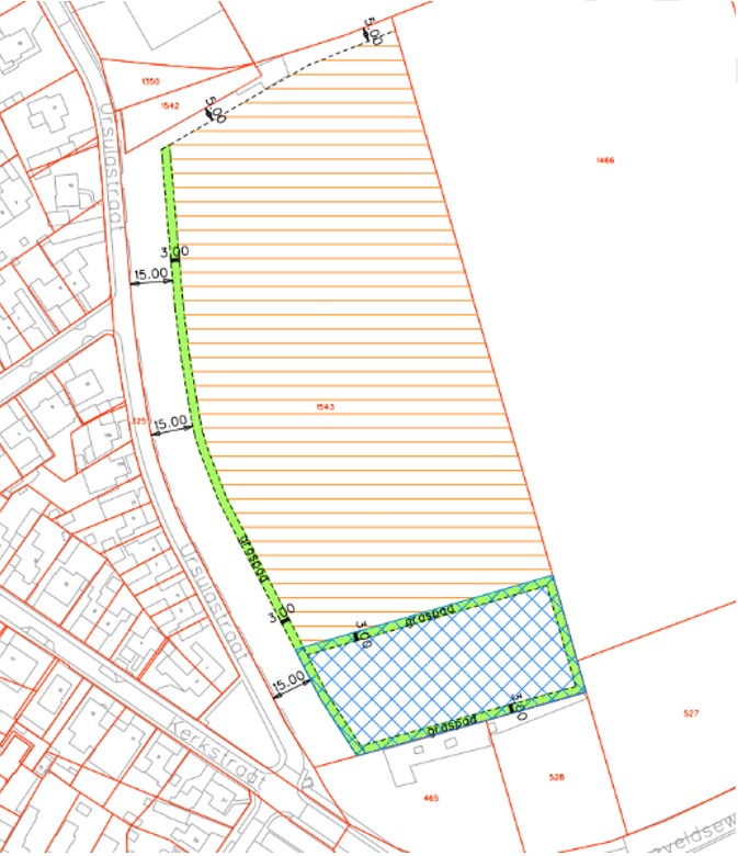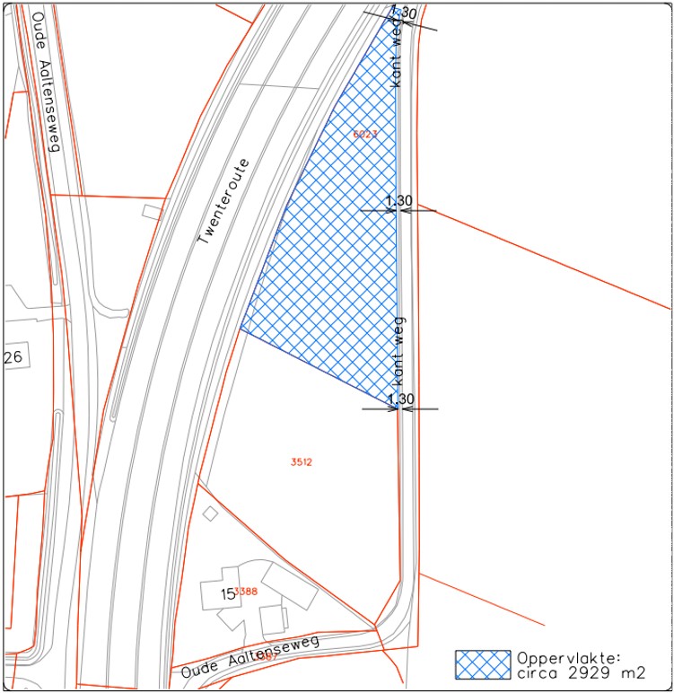 Het te pachten perceel is groot ca. 2929 m² en is middels blauwe lijnen weergegeven op onderstaande tekening. Het te pachten gebied is bestemd in het bestemmingsplan ‘Consolidatieplan Buitengebied Oost Gelre 2018’ en heeft hierin de bestemming ‘Agrarisch met waarden - landschapswaarden’.