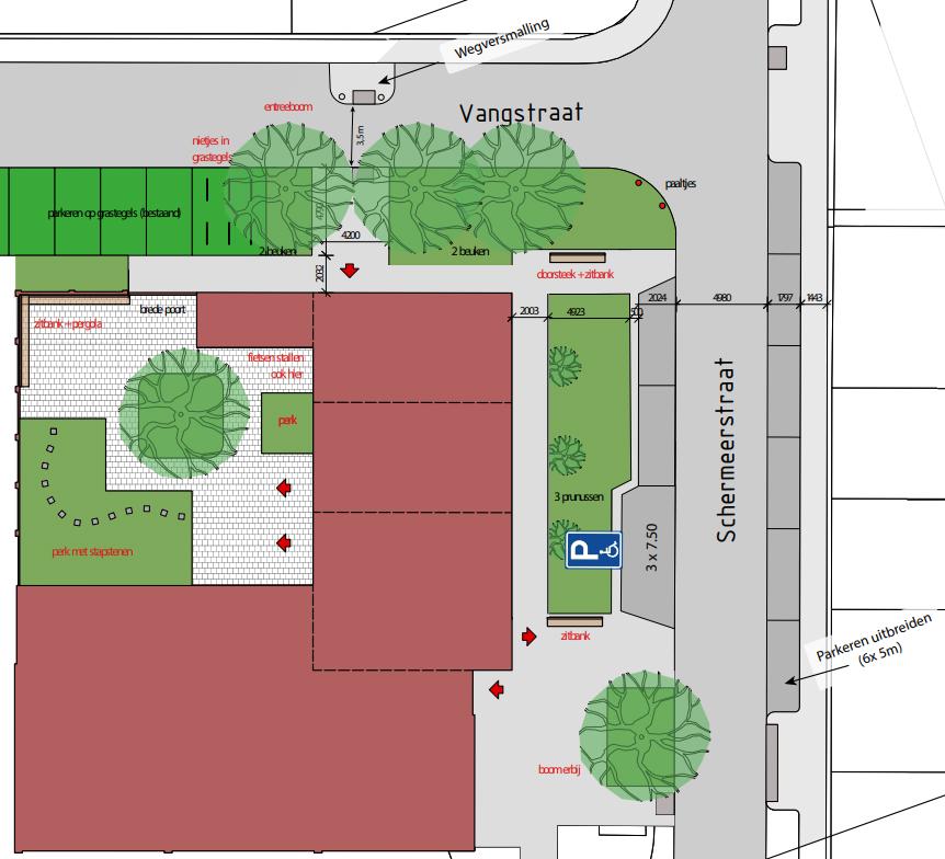 Op het Schermeerstraat bevindt zich het nieuwe dorpshuis. Tijdens een participatieronde heeft de buurt een verzoek ingediend voor een algemene gehandicaptenparkeerplaats.
