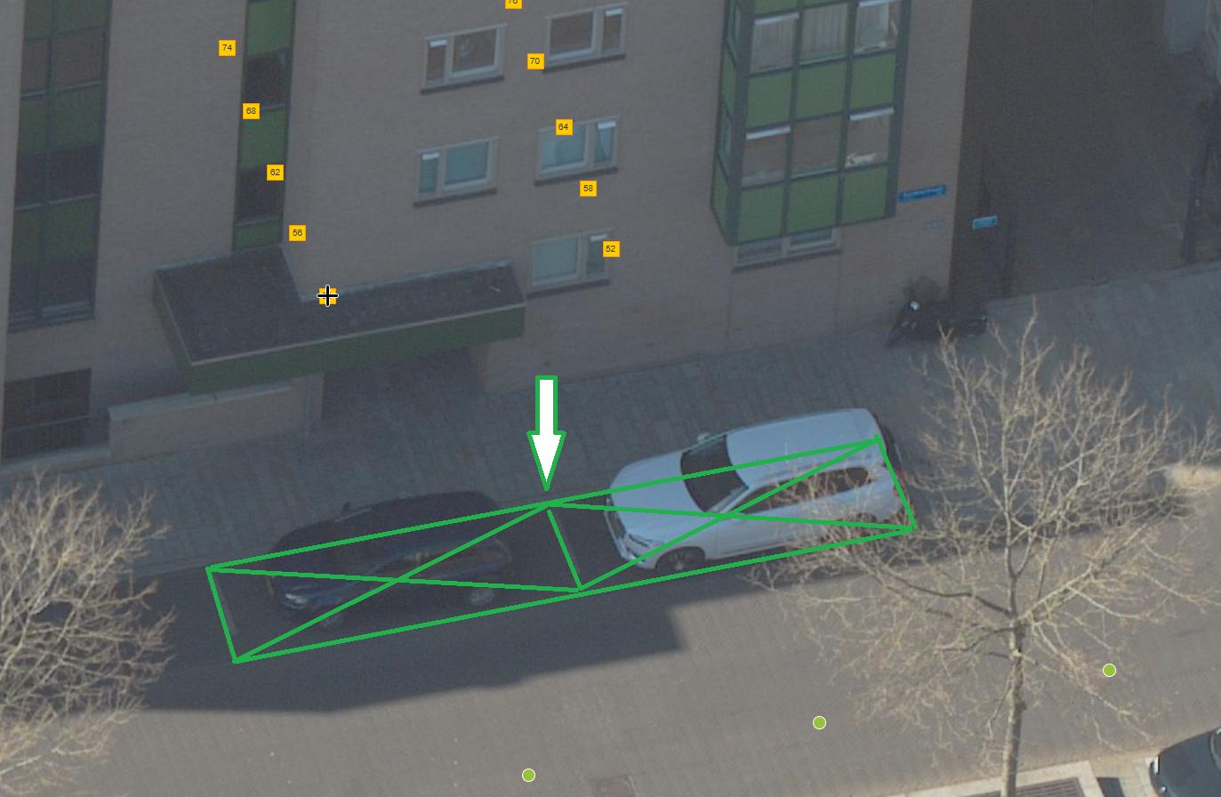 De parkeerplaatsen zijn alleen bedoeld voor het opladen van elektrische auto’s. Daarom plaatsen we het verkeersbord E08c (dit staat in bijlage I van het RVV 1990). We plaatsen ook het verkeersbord OB504 daaronder. Dit is een bord met twee pijlen die wijzen naar de parkeerplaatsen.
