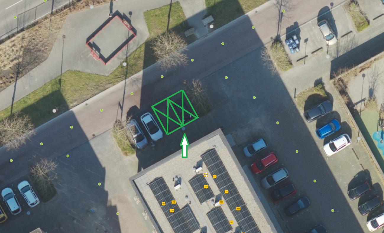 De parkeerplaatsen zijn alleen bedoeld voor het opladen van elektrische auto’s. Daarom plaatsen we het verkeersbord E08c (dit staat in bijlage I van het RVV 1990). We plaatsen ook het verkeersbord OB504 daaronder. Dit is een bord met twee pijlen die wijzen naar de parkeerplaatsen.