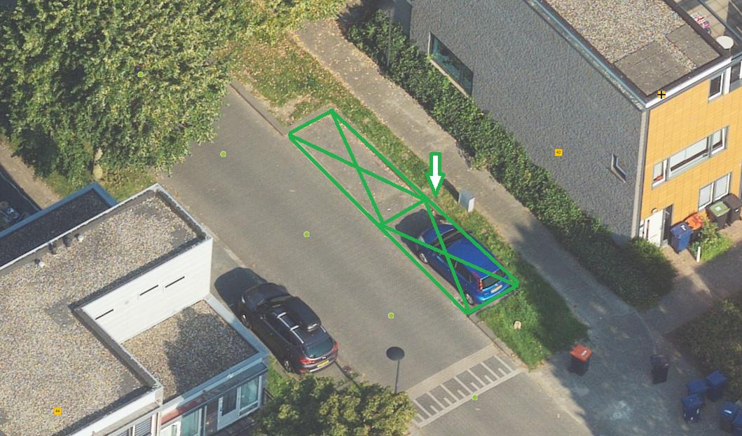 De parkeerplaatsen zijn alleen bedoeld voor het opladen van elektrische auto’s. Daarom plaatsen we het verkeersbord E08c (dit staat in bijlage I van het RVV 1990). We plaatsen ook het verkeersbord OB504 daaronder. Dit is een bord met twee pijlen die wijzen naar de parkeerplaatsen.