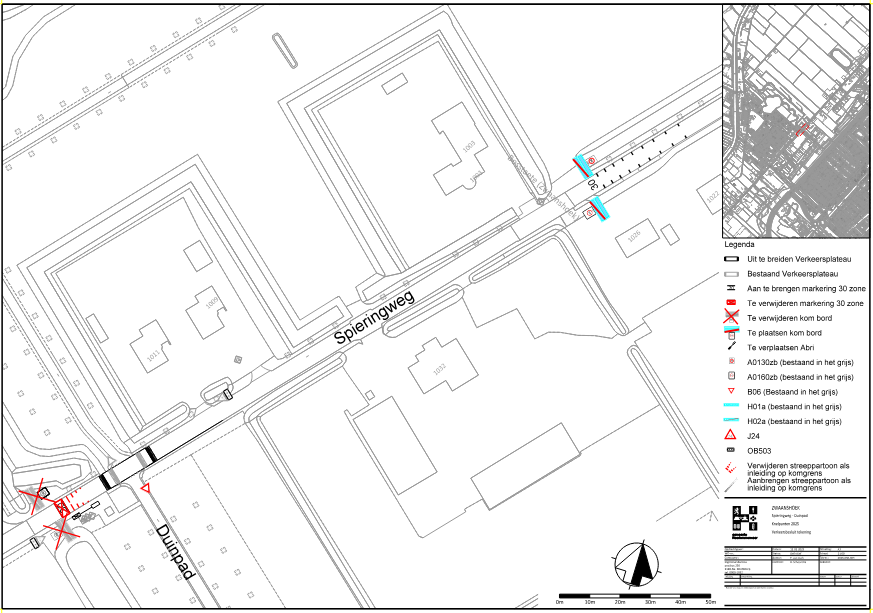 De bebouwde komgrens ter hoogte van het Duinpad wordt verplaatst naar een locatie ter hoogte van Spieringweg nummer 1003 en de overgang van het vrijliggende (brom)fietspad naar de weg, door het plaatsen van portalen voorzien van borden H1 en H2 zoals bedoeld in bijlage 1 van het Reglement Verkeersregels en Verkeerstekens (RVV) 1990 op de volgende locatie: