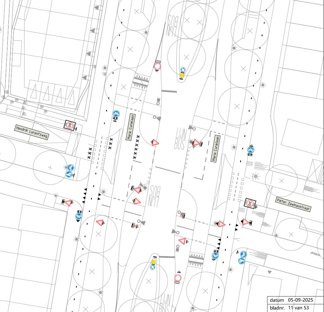 Ter hoogte van de kruising Marie Curielaan en Pieter Zeemanstraat en Hendrik Lorentzweg een voorrangssituatie in te stellen, alsmede het instellen van een verplicht voetpad, een verplicht fietspad, een gesloten verklaring uitgezonderd lijnbussen, een herhaling van een 30 km zone en een aangegeven rijrichting.