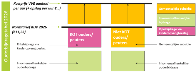 Het verschil tussen het normtarief en de kostprijs VVE aanbod per uur (de plus) wordt gesubsidieerd door de gemeente. In het figuur is dit gevisualiseerd met het bovenste (gele) blokje in de rechterkolom.
