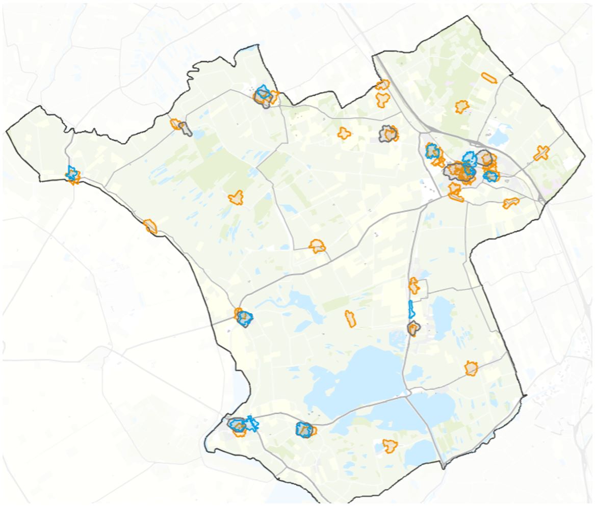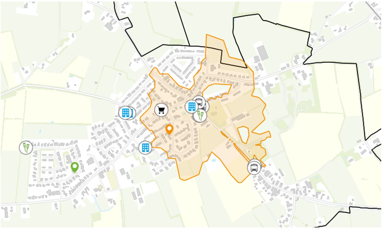 Hieronder is een voorbeeldkaart opgenomen met daarop gebieden waar voorzieningen nabij zijn. Blauwe vlekken tonen het gebied waarin een huisarts te bereiken is binnen een afstand van maximaal 5 minuten lopen; oranje vlekken tonen het gebied waarin het maximaal 5 minuten lopen is naar een ontmoetingsplek zoals een dorpshuis en grijze vlekken het gebied waarin het maximaal 5 minuten lopen is naar een supermarkt.
