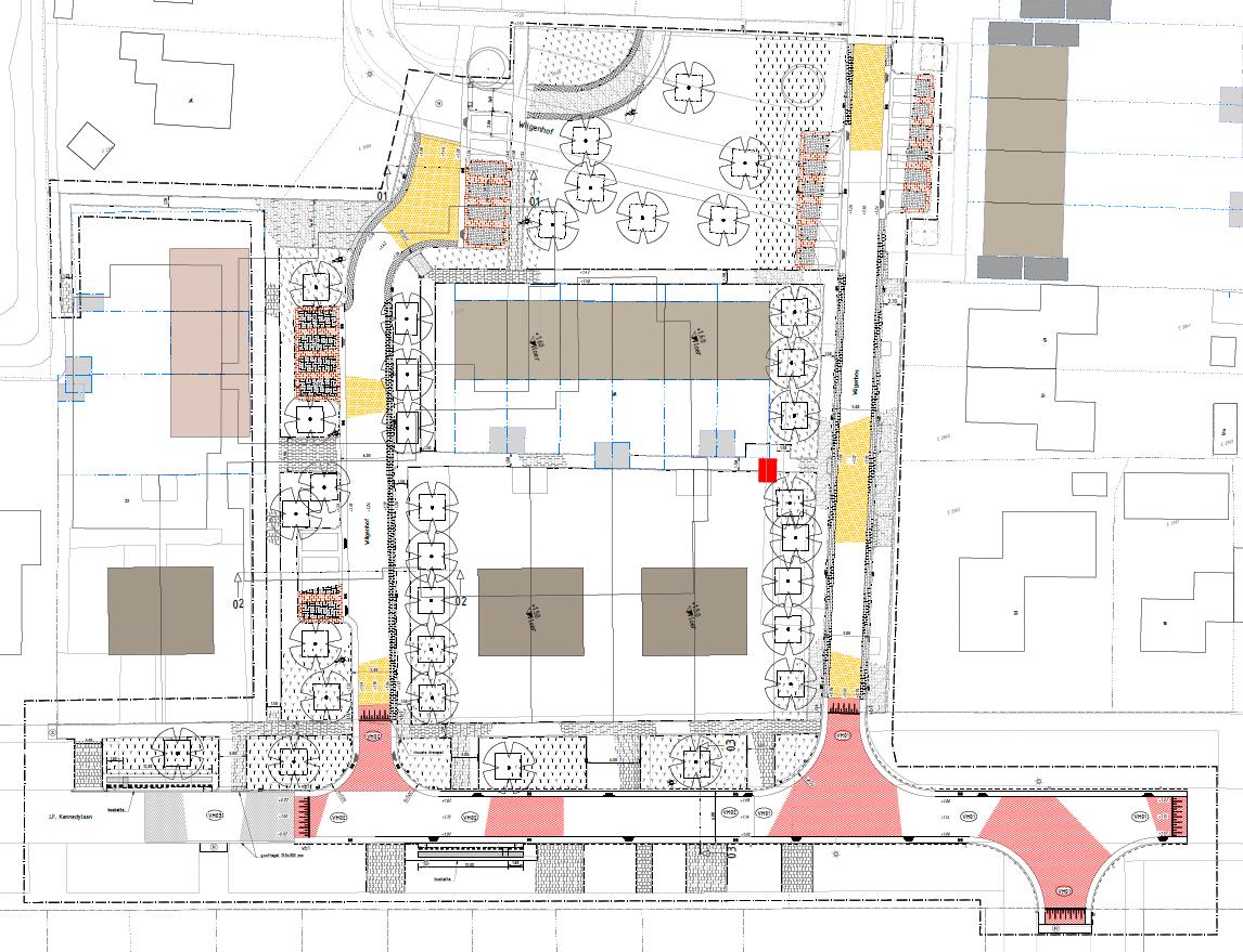 in de nieuwe situatie het weggedeelte vanaf de J.F. Kennedylaan 16 tot en met de kruising met de Wilgenhof wordt in de nieuwe situatie verhoogd en met een afwijkende kleur asfalt (rood) geaccentueerd;