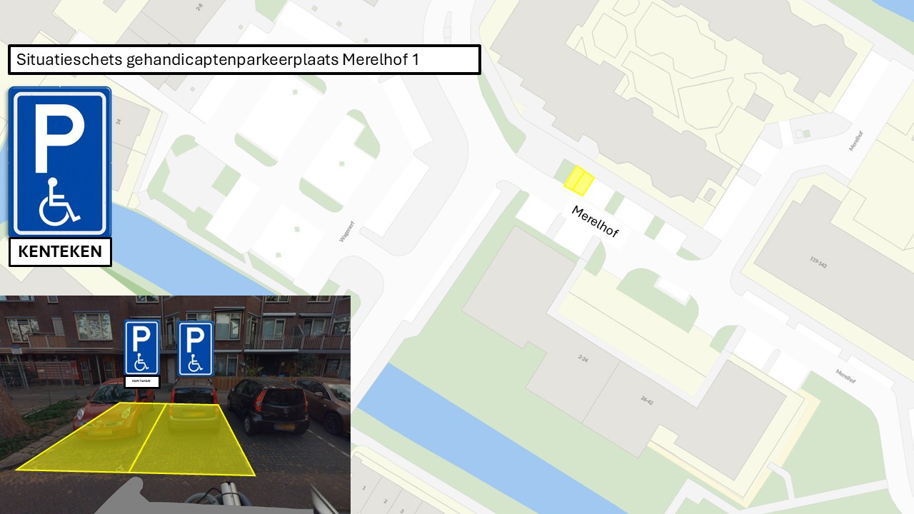 1. Door het plaatsen van een bord volgens model E6 van Bijlage I van het RVV, met daaronder een onderbord conform model OB309 waarop het actuele kenteken van het bij de betrokkene in gebruik zijnde voertuig wordt vermeld, een parkeerplaats te reserveren als "parkeerplaats motorvoertuig gehandicapten" aan de Merelhof, nabij huisnummer 1, zoals nader aangeduid op bovenstaande situatietekening.