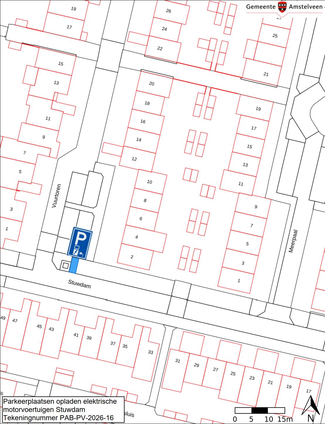 Burgemeester en wethouders van Amstelveen besluiten om hun besluit van 18 februari 2026 (zaaknummer Z26-016487), waarbij één parkeerplaats in de straat Stuwdam is aangewezen als parkeerplaats voor het opladen van elektrische motorvoertuigen, in te trekken. Dit betekend dat de uitvoering van dit besluit achterwege blijft en dat het bord E8c van bijlage 1 van het Reglement Verkeersregels en Verkeerstekens 1990 (RVV 1990), met onderbord, op de genoemde locatie niet worden geplaatst. De parkeerplaats waarvoor de aanwijzing vervalt is weergegeven op de in dit besluit opgenomen tekening PAB-PV-2026-16.