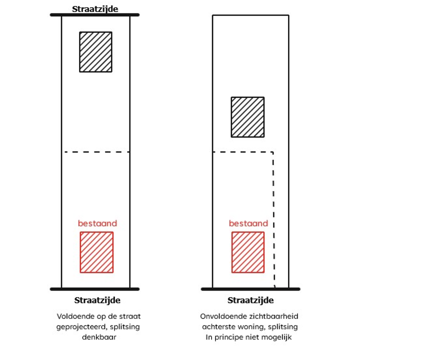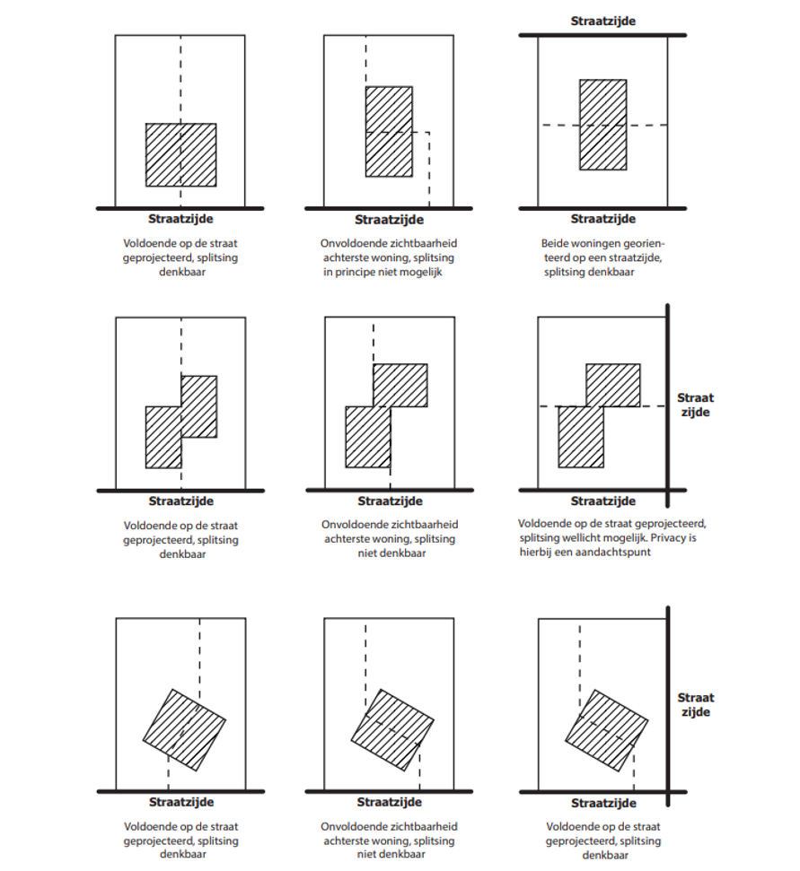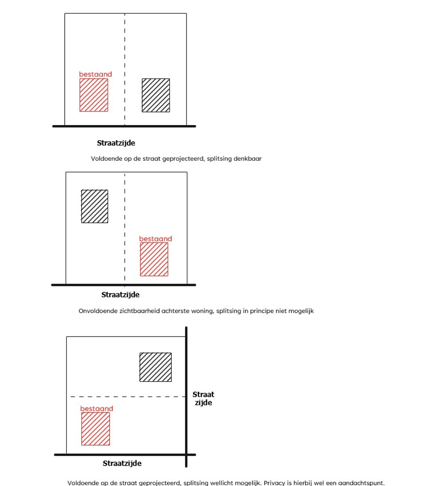 Hieronder zijn verschillende situaties geschetst van woningsplitsing. Het primaire stedenbouwkundige toetsingskader bij initiatieven is dat woningsplitsing niet mag leiden tot een aantasting van de bestaande stedenbouwkundige structuur. Bestaande rooilijnen en zichtbaarheid vanaf het openbaar toegankelijk gebied zijn belangrijke aspecten van de stedenbouwkundige beoordeling. Wonen in de tweede lijn is stedenbouwkundig gezien niet wenselijk. Beide woningen moeten zichtbaar zijn vanaf het openbaar toegankelijk gebied. Nieuwe ontwikkelingen mogen de privacy van reeds bestaande percelen en woningen niet onevenredig aantasten.