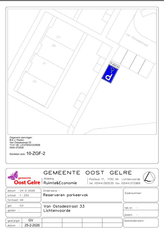Verkeersbesluit voor het aanwijzen van een gehandicaptenparkeerplaats op kenteken op de parkeerplaats aan Van Ostadestraat 33 te Lichtenvoorde
