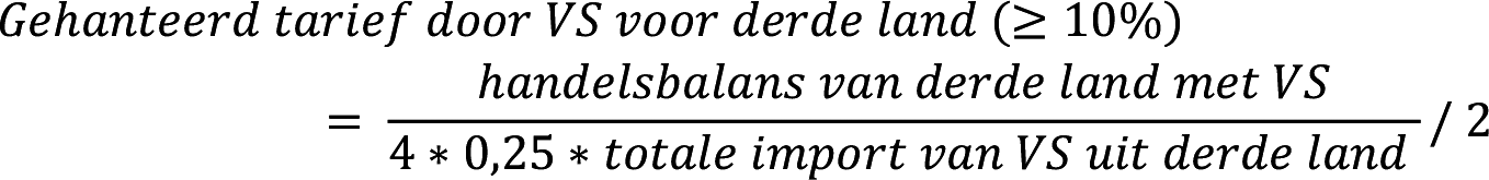 Voor wat betreft de onderbouwing van de nieuwe landenspecifieke importtarieven van de VS kan het volgende worden vermeld. De handelsvertegenwoordiger van de VS (United States Trade Representative, USTR) heeft een onderbouwing voor de gehanteerde tarieven gepubliceerd.26 Deze onderbouwing bevat de volgende formule: