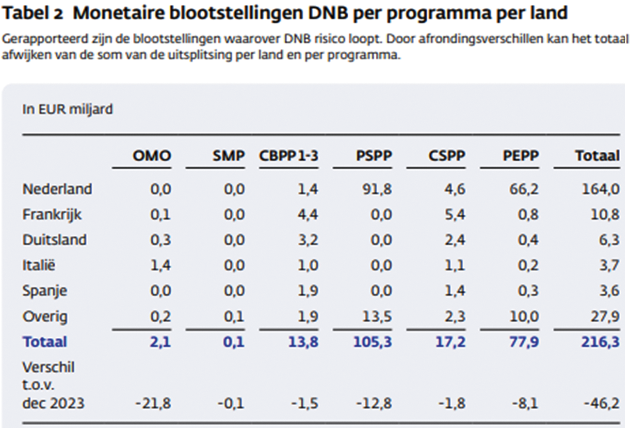 De Kamer kan in het Jaarverslag van DNB de blootstelling van DNB op de monetaire operaties zien, per land en per programma. Dit overzicht (zie tabel hieronder) is hetzelfde als het overzicht dat in de jaarlijkse rapportage werd opgenomen.