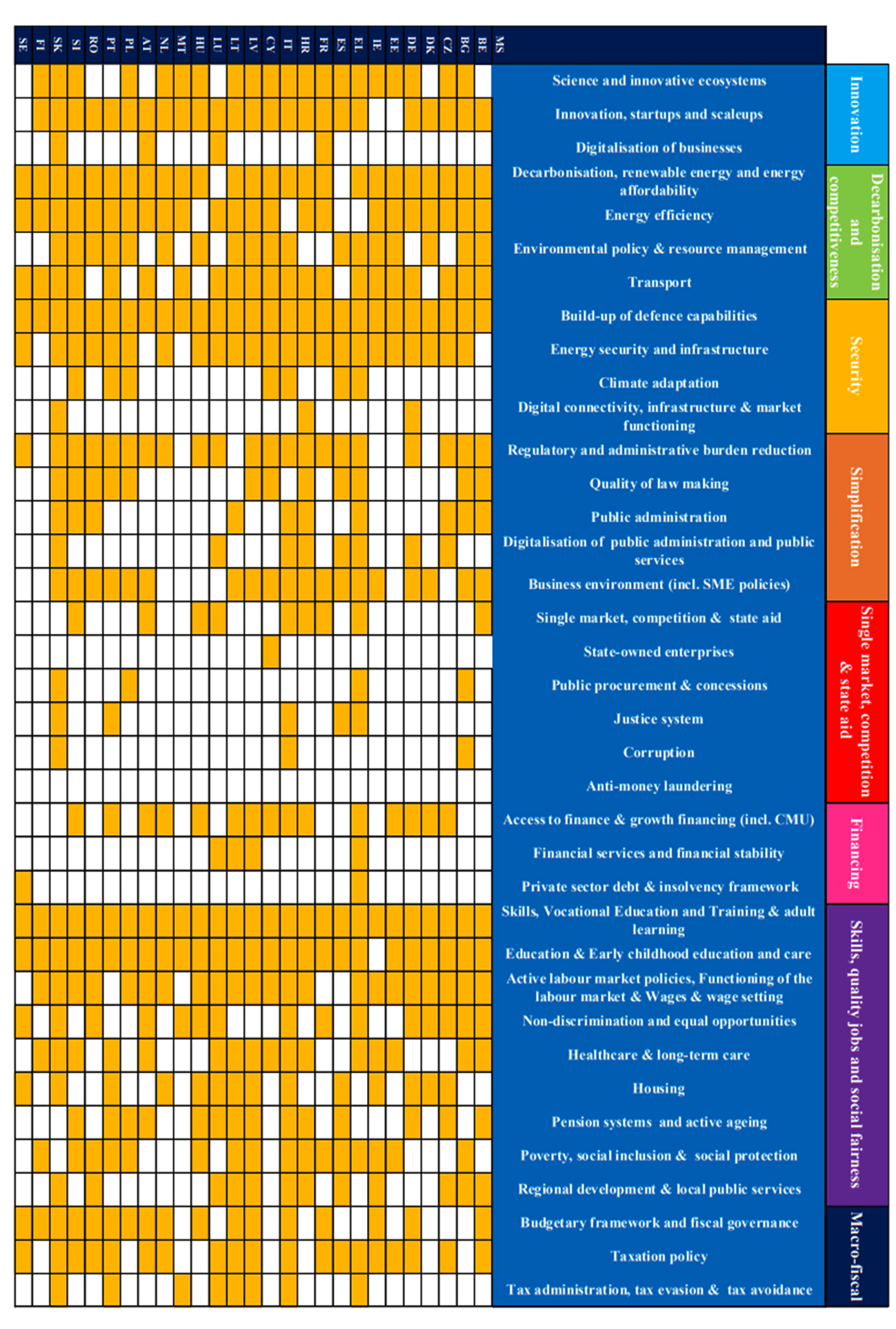 De voorgestelde aanbevelingen over defensie uitgaven zijn voorgesteld voor alle lidstaten. Verder stelt de Commissie voor andere lidstaten in deze categorie bijvoorbeeld aanbevelingen voor om publieke investeringen te verhogen (Duitsland), het belastingstelsel te herzien en te simplificeren (Spanje) en de efficiëntie en effectiviteit van publieke investeringen te verhogen (Italië).