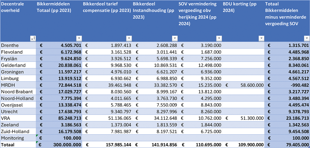 Op 17 november 2023 is door het kabinet vervolgens besloten de motie Bikker en de motie-Krul uit te voeren. Met uitvoering van de motie-Bikker werd structureel ongeveer € 158 miljoen beschikbaar gesteld aan de decentrale ov-autoriteiten om de prijsstijging van ongeveer 12% van 2024 structureel op te vangen. Hierdoor is de prijs van het regionale ov in 2025 alleen geïndexeerd met de reguliere prijsontwikkeling over dat jaar. Daarnaast bestaan de «Bikker-middelen» nog uit € 142 miljoen per jaar om het ov op peil te houden dan wel de kwaliteit van het ov te verbeteren. Deze middelen blijven onverminderd beschikbaar voor het ov. De «Bikker-middelen» zijn via een (separate Decentralisatie Uitkering) aan provincies ter beschikking gesteld. Voor de vervoerregio’s komen de middelen via de BDU Verkeer en vervoer.