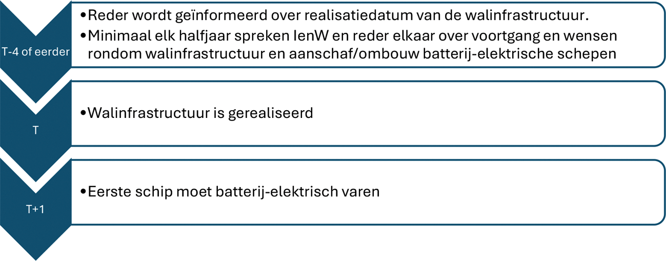 Vervolgens zal er een proces worden gestart tussen IenW en de reder om ervoor te zorgen dat de infrastructuur goed aansluit op het door de reder gewenste batterij-elektrische schip. Vervolgens wordt van de reders geëist om, een jaar na realisatie van de benodigde walinfrastructuur, met minimaal één schip per jaar batterij-elektrisch te gaan varen totdat alle schepen batterij-elektrisch varen. De tijdlijn ziet er dan als volgt uit:
