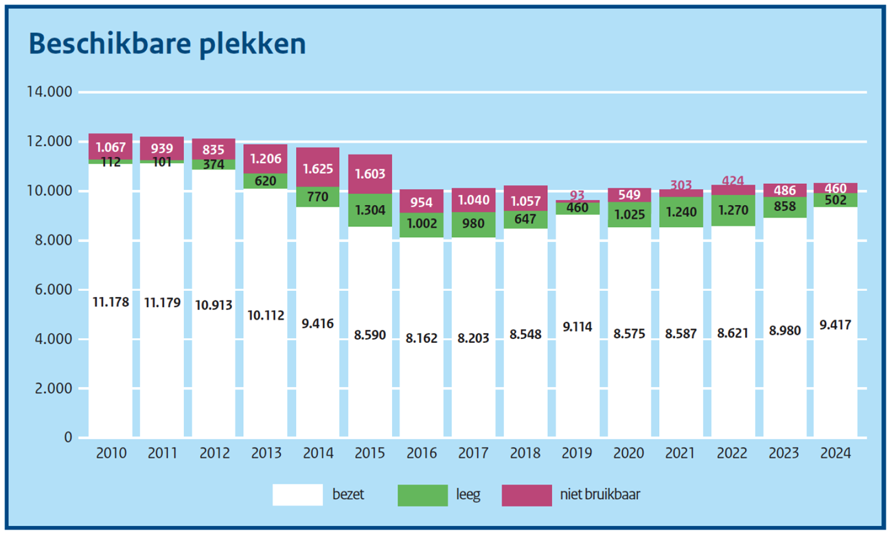 Het betreft hier de totale capaciteit en bezetting van het gevangeniswezen. Plaatsen kunnen om verschillende redenen niet bruikbaar zijn: ze kunnen bijvoorbeeld aangewezen zijn als buffercapaciteit, tijdelijk niet bruikbaar om bouwkundige, personele of organisatorische redenen of vanwege contra-indicaties voor plaatsing op MPC. Daarnaast is er leegstand op specifieke regimes (bijvoorbeeld op de EBI of de TA) en is er af en toe leegstand op meetmomenten vanwege in- en uitschrijvingen bij nieuwe instroom en overplaatsingen.