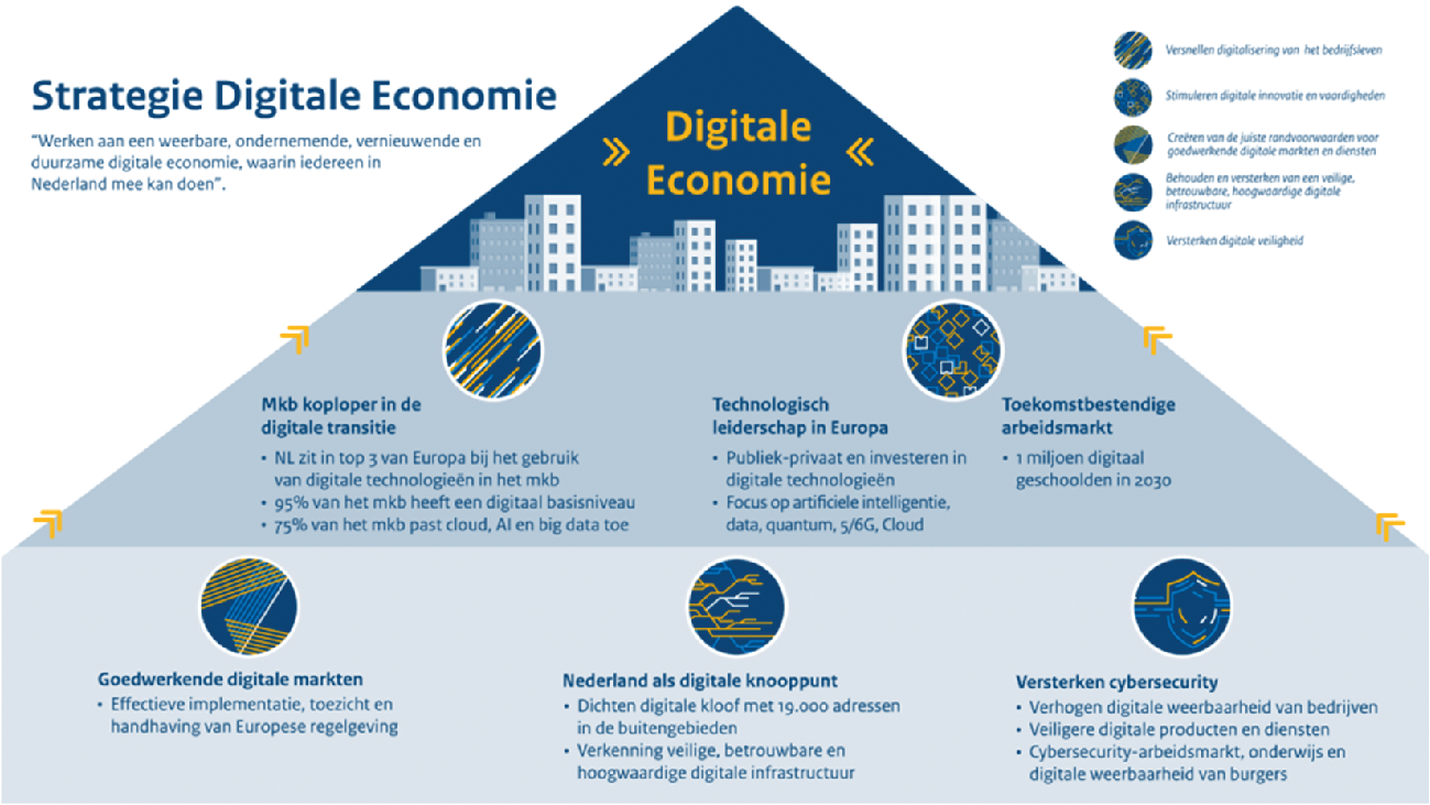 In november 2022 werd de Strategie Digitale Economie3 gepresenteerd met ambities en doelstellingen tot en met 2030. Deze strategie richt zich op het realiseren van een welvarende en weerbare digitale economie, en richt zich in lijn met het Europese beleid van het Digitaal Decennium4 op het realiseren van doelstellingen in 2030.