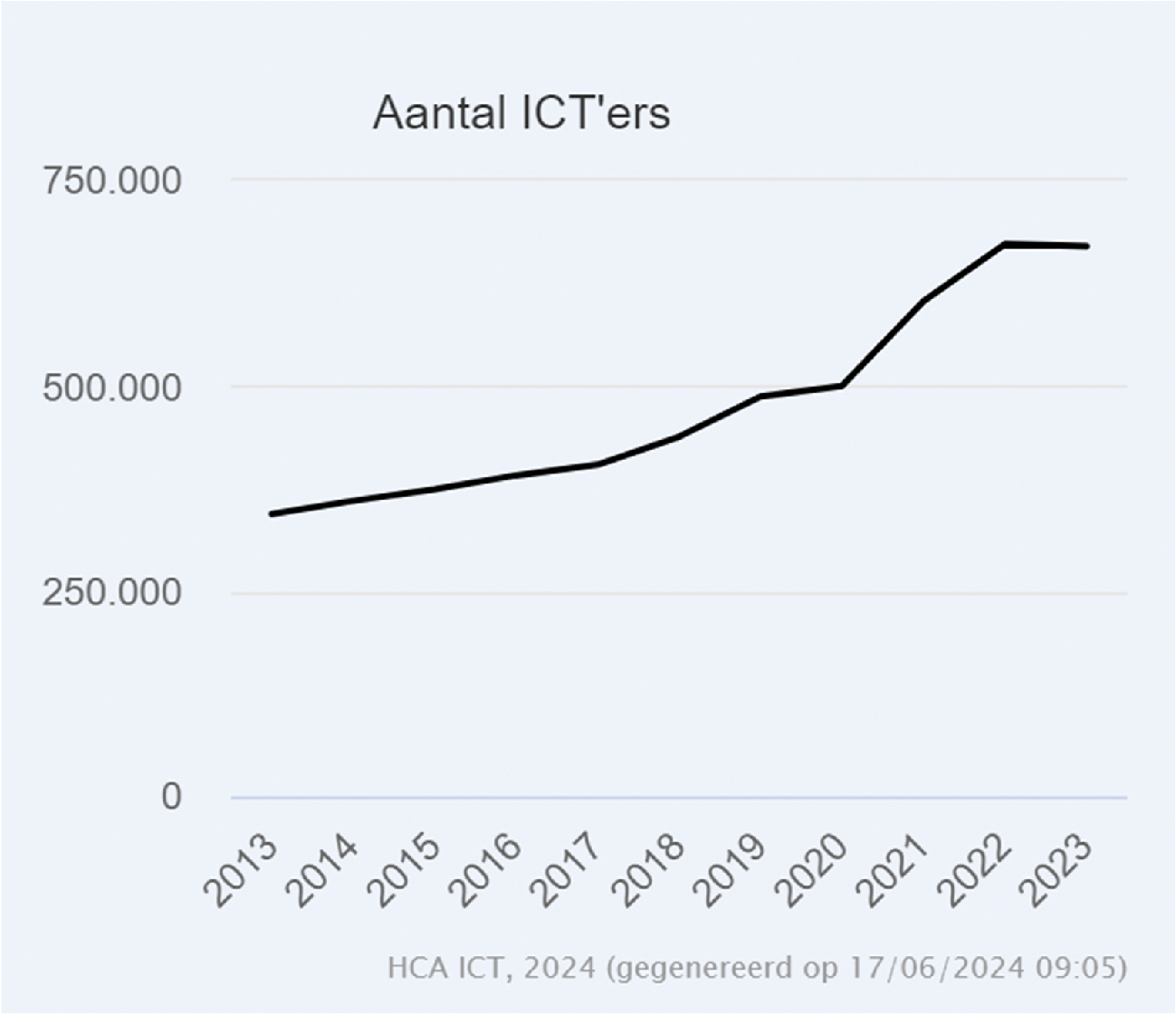 Bedrijven, brancheorganisaties en belangenvertegenwoordigers hebben afgelopen jaar een duidelijk geluid laten horen: de belangrijkste belemmering om de kansen van de digitale transitie te verzilveren is het aanhoudend tekort aan digitale professionals. Het slechte nieuws is dat het aanbod aan digitale professionals, dat afgelopen jaren gestaag groeide, het afgelopen jaar tot stilstand is gekomen. Volgens de nieuwste definitie van Human Capital Agenda ICT waren er in 2022 673.000 digitale professionals, waarvan 70.000 nieuwe ICT’ers. In 2023 daalde het totaal aantal digitale professionals met 3.000 naar 670.000.