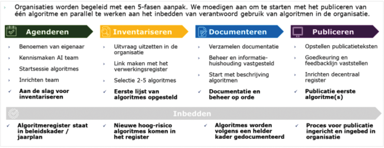 In 2023 is een projectgroep gestart om JenV en AenM organisaties te ondersteunen bij het publiceren van impactvolle algoritmen en hoogrisico-AI-systemen in het algoritmeregister. Hierin wordt gewerkt met een aanpak (zie bijlage I) in 5 fasen: agenderen, inventariseren, documenteren, publiceren en inbedden. Inmiddels zijn organisaties in de fase van publiceren én actief met het inbedden van het algoritmeregister in de organisatie. In de projectgroep wordt hulp geboden bij het opstellen van publicatieteksten op B1-niveau om de kwaliteit en begrijpelijkheid van registraties voor burgers te verhogen. Ook worden er twee keer per jaar publicatiemomenten georganiseerd waarbij nieuwe publicaties worden gepresenteerd. Hierbij is ook aandacht voor de nieuwe transparantieverplichtingen die volgen uit de AI-verordening, die in augustus 2024 in werking is getreden. De voortgang voor de vulling van het algoritmeregister wordt elk kwartaal besproken in de CDO- en CIO-raad van JenV/AenM, waar de chief data officers en de chief information officers van de organisaties in het JenV/AenM-domein zitting in hebben.