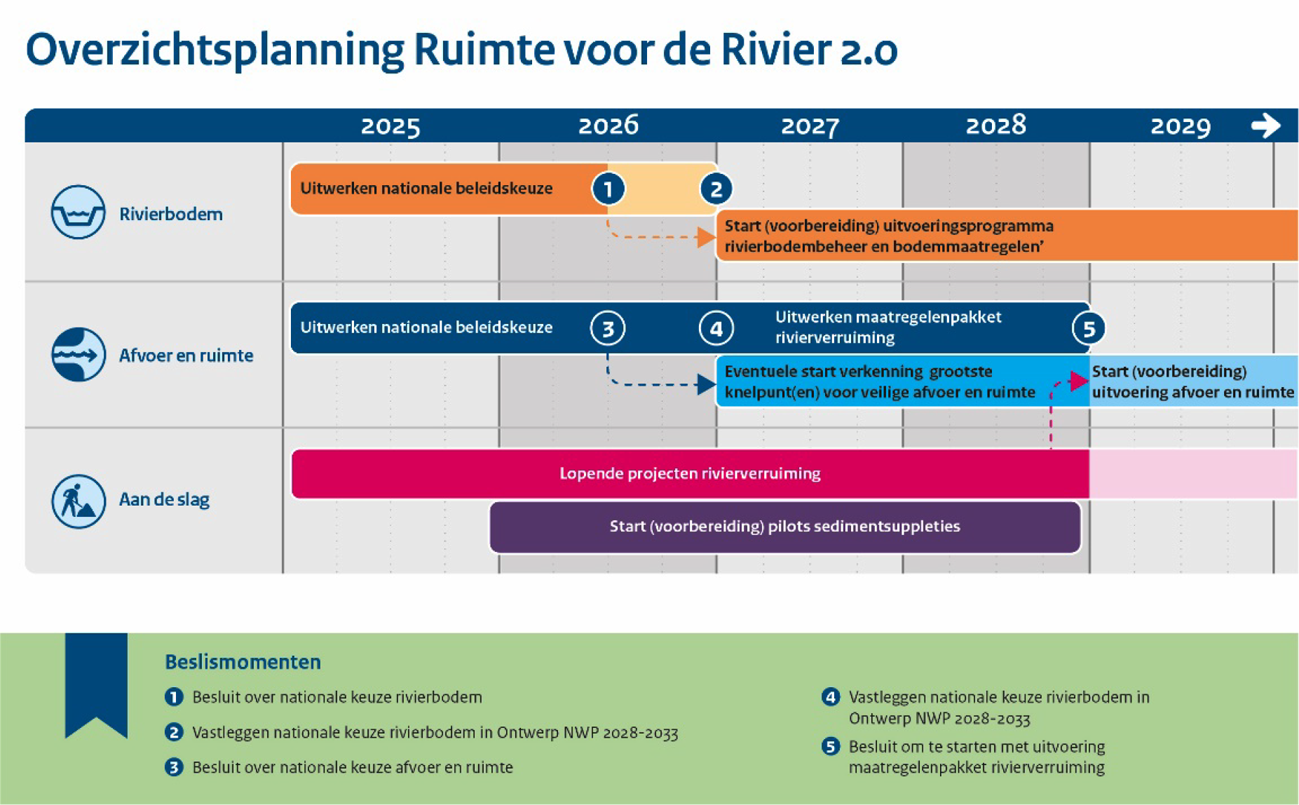 In 2026 worden keuzes gemaakt over een verder uitgewerkte doelstelling en het maatregelenpakket voor de rivierbodemligging. Er wordt dan besloten welke strategie gebruikt gaat worden om de bodem van de Maas en de Rijntakken te stabiliseren en er worden keuzes gemaakt over het type, de volgorde, de omvang, de fasering en de doelstellingen van de bodemmaatregelen die uit deze strategie voortkomen. Voor afvoercapaciteit en ruimte wordt een visie ontwikkeld op welke manier we de hogere afvoeren in de toekomst veilig kunnen verwerken en hoeveel ruimte er nodig is voor de verschillende rivierfuncties. Op basis daarvan wordt bepaald op welke locaties extra ruimte voor de rivier nodig is. Dit geeft inzicht en leidt tot duidelijkheid of de huidige ruimtelijke reserveringen toereikend zijn om de maatregelen uit te voeren of dat hiervoor aanvullende ruimtereserveringen nodig zijn.3