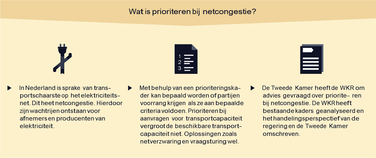 In Nederland is sprake van transportschaarste op het elektriciteitsnet; dit heet netcongestie. Doordat de behoefte aan stroomtransport op dit moment groter is dan het net toelaat, zijn wachtrijen ontstaan voor transportcapaciteit. Met een prioriteringskader kan een bepaalde partij in de wachtrij voorrang krijgen bij vrijgekomen capaciteit, bijvoorbeeld omdat deze partij bijdraagt aan een maatschappelijk doel. Prioriteren is geen oplossing voor netcongestie. Aangezien de adviesvraag van de Tweede Kamer is gericht op prioriteren, beperkt de WKR zich tot een analyse op prioriteren in de context van netcongestie.