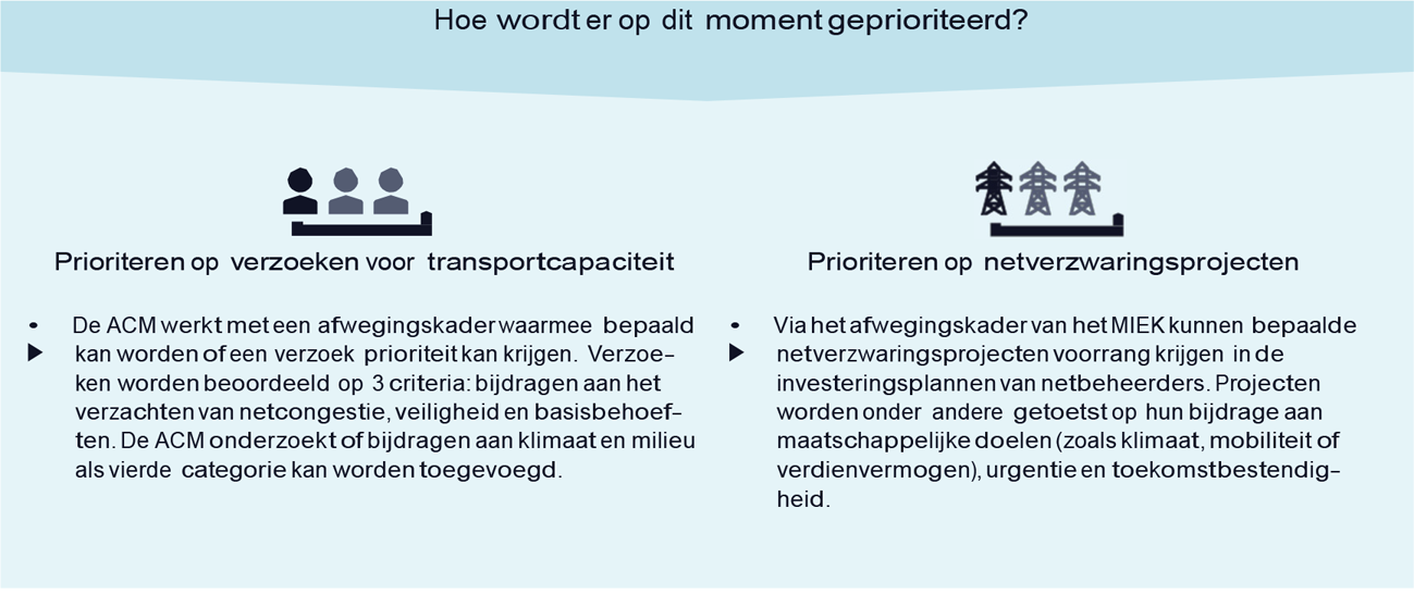 Om te bepalen welke mogelijkheden er zijn voor extra prioritering, heeft de WKR geanalyseerd op welke manieren er nu wordt geprioriteerd. Ook is in kaart gebracht wie dit doet, welke maatschappelijke doelen daarbij centraal staan en welke rol de Tweede Kamer kan spelen. Hieronder omschrijft de WKR de twee relevante prioriteringskaders voor netcongestie: het kader voor transportcapaciteit (van de ACM) en het kader voor energie-infrastructuur (van het MIEK), waarmee transportcapaciteit vergroot wordt.