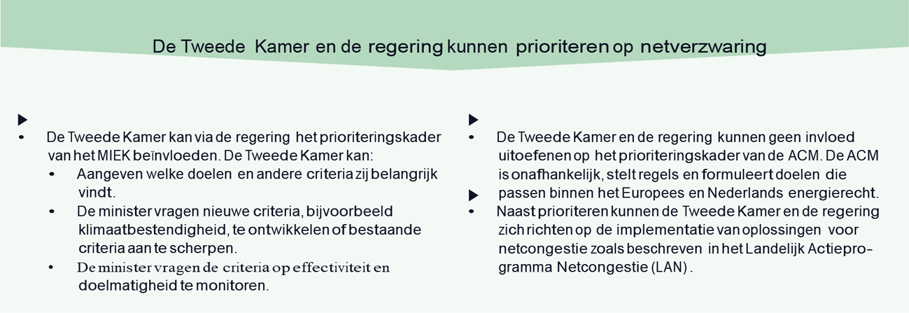 Uit deze beknopte analyse volgt een aantal bevindingen. Allereerst zijn de Tweede Kamer en de regering niet bevoegd om invloed uit te oefenen op het prioriteringskader van de ACM, vanwege de onafhankelijke positie van de ACM. Maar de Tweede Kamer en de regering hebben wél bevoegdheden om het afwegingskader van het MIEK te beïnvloeden en aan te passen. De Tweede Kamer kan aangeven welke doelen en andere criteria zij belangrijk vindt. Daarnaast kan zij de Minister vragen om nieuwe criteria, zoals klimaatbestendigheid, te ontwikkelen of om bestaande criteria aan te scherpen. Ten slotte kan de Tweede Kamer de Minister vragen het kader te evalueren op effectiviteit en doelmatigheid. Inzichten uit zo’n evaluatie zouden input kunnen vormen voor de uitbreiding van het prioriteringskader van de ACM.