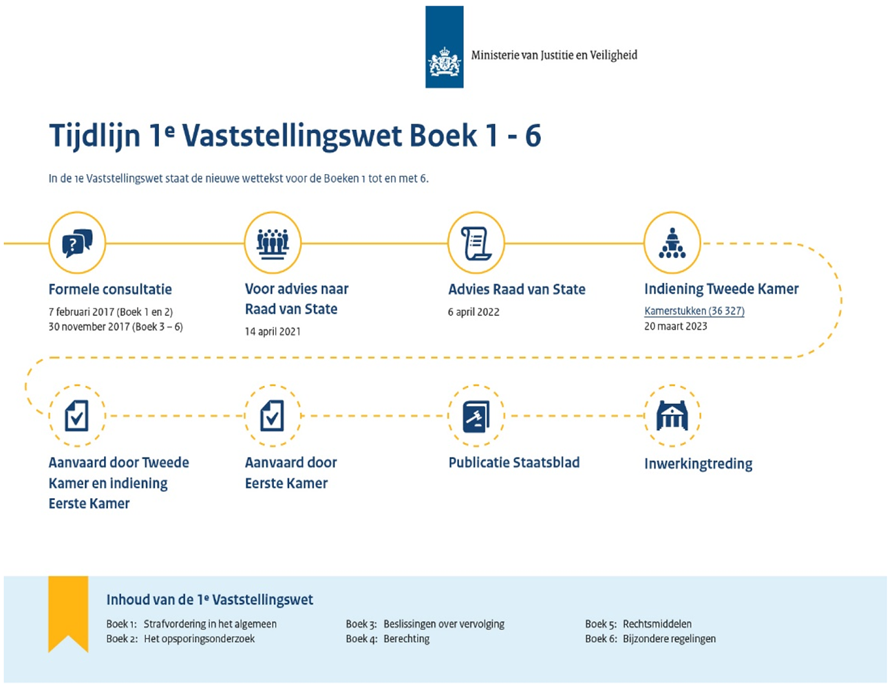 Sinds 2014 wordt gewerkt aan de totstandkoming van een nieuw Wetboek van Strafvordering. Zoals in het regeerprogramma benoemd (bijlage bij Kamerstuk 36 471, nr. 96), ziet het kabinet het nieuwe wetboek als nieuwe wetgeving ten behoeve van de nationale veiligheid en voert het kabinet actief regie voert op alle noodzakelijke voorbereidingen van de betrokken organisaties met het oog op de geplande inwerkingtreding van dit nieuwe wetboek in april 2029.