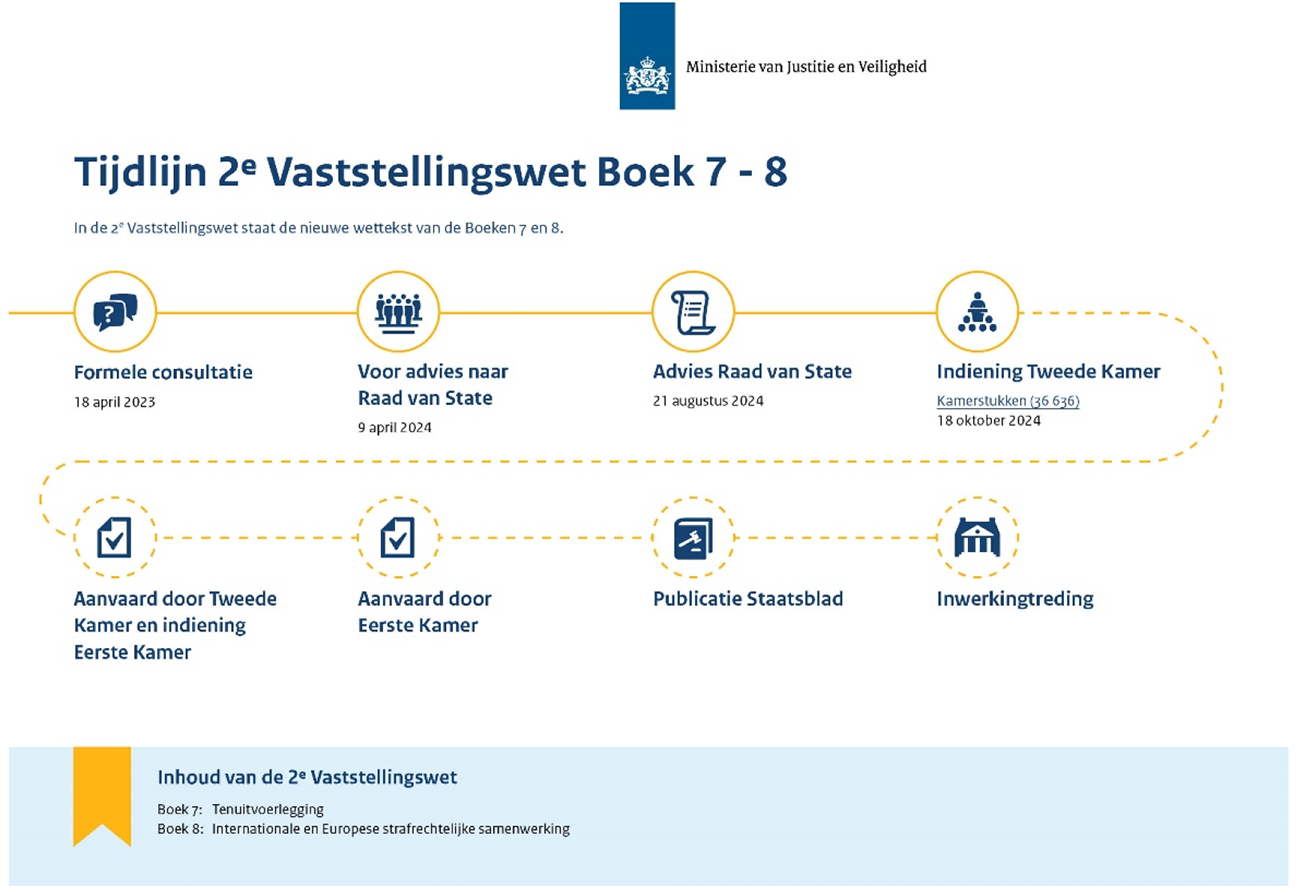 Op het moment van schrijven van de negende voortgangsrapportage werd gewerkt aan de verwerking van de formele consultatieadviezen over dit wetsvoorstel in het voorstel en de memorie van toelichting. Dit wetsvoorstel is daarna begin april 2024 voor advies voorgelegd aan de Afdeling advisering van de Raad van State. Op 21 augustus 2024 volgde het advies van de Raad van State over de tweede vaststellingswet.5 De Raad van State plaatste in zijn qua omvang beperkte advies met als positief dictum B een aantal opmerkingen bij het voorstel en adviseerde daarmee rekening te houden voordat het voorstel bij de Tweede Kamer zou worden ingediend. Dit maakte dat wij dit advies op redelijk korte termijn hebben kunnen verwerken in het voorstel en de memorie van toelichting. De gemaakte keuzes zijn toegelicht in het nader rapport. Dit nader rapport is samen met het wetsvoorstel van de tweede vaststellingswet en de memorie van toelichting op 18 oktober jl. bij de Tweede Kamer ingediend.6 Inmiddels heeft de Tweede Kamer de inbrengdatum voor het verslag bij de tweede vaststellingswet vastgesteld op 12 december 2024. De Tweede Kamer besloot eerder om rapportages van de universiteiten over de Boeken 7 en 8 achterwege te laten en om de mondelinge behandeling van de tweede vaststellingswet mee te nemen bij het plenaire debat over het Wetboek van Strafvordering na de wetgevingsoverleggen in het voorjaar van 2025.