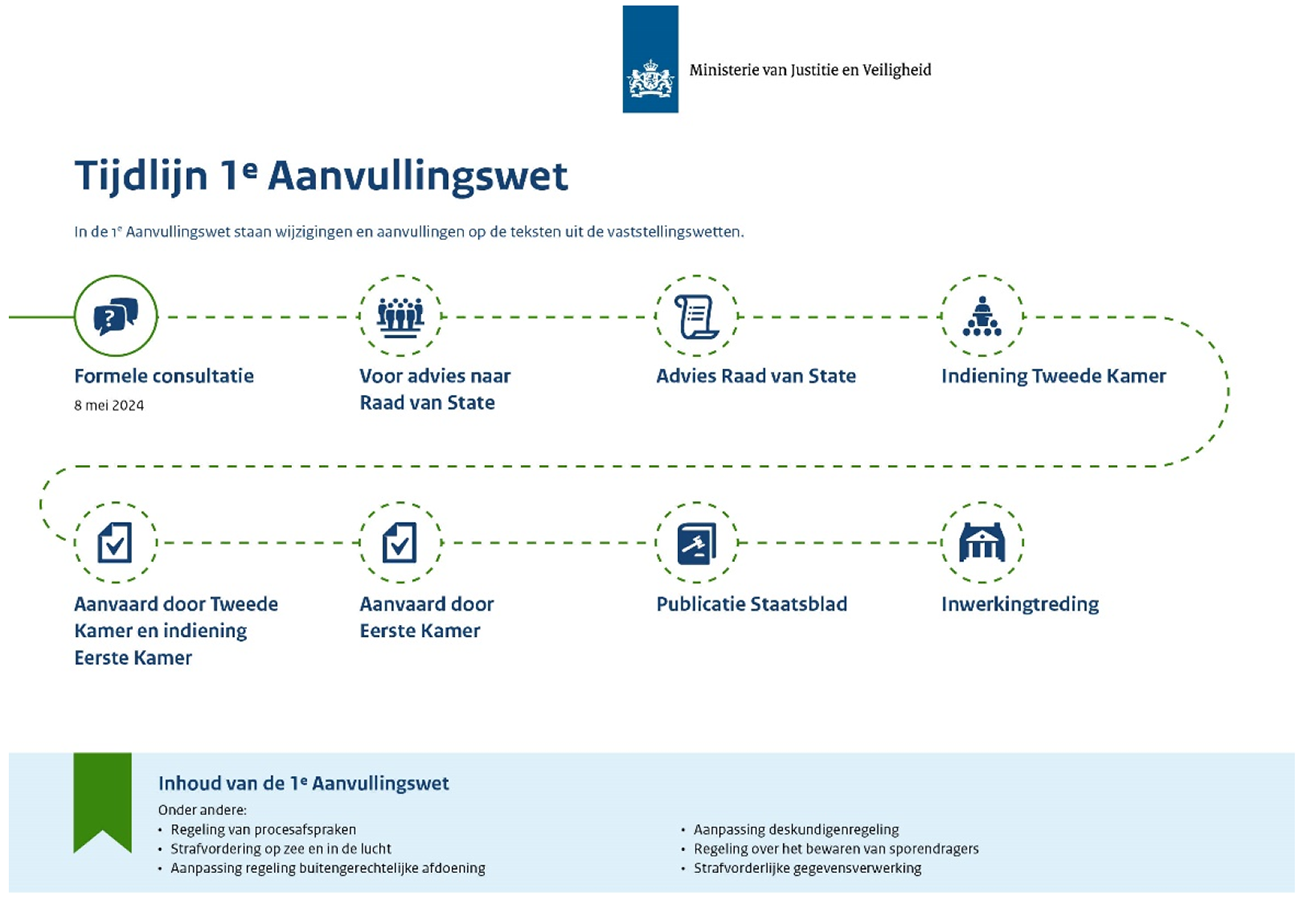 Ten tijde van de vorige voortgangsrapportage werd nog gewerkt aan de ambtelijke voorbereiding van de eerste aanvullingswet. Ook op dit dossier is het afgelopen jaar de nodige voortgang geboekt. Zo zijn het conceptwetsvoorstel en de bijbehorende memorie van toelichting op 8 mei 2024 in formele consultatie gegeven voor een periode van vier maanden. Op dit moment wordt gewerkt aan de verwerking van de ontvangen consultatieadviezen. Wij streven ernaar om deze eerste aanvullingswet in het eerste kwartaal van 2025 voor advies voor te leggen aan de Afdeling advisering van de Raad van State.