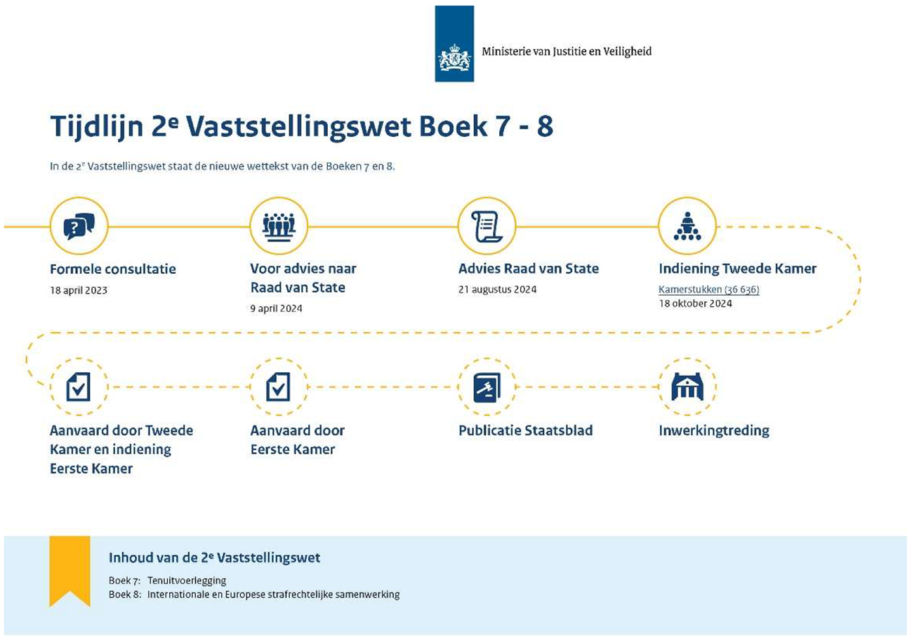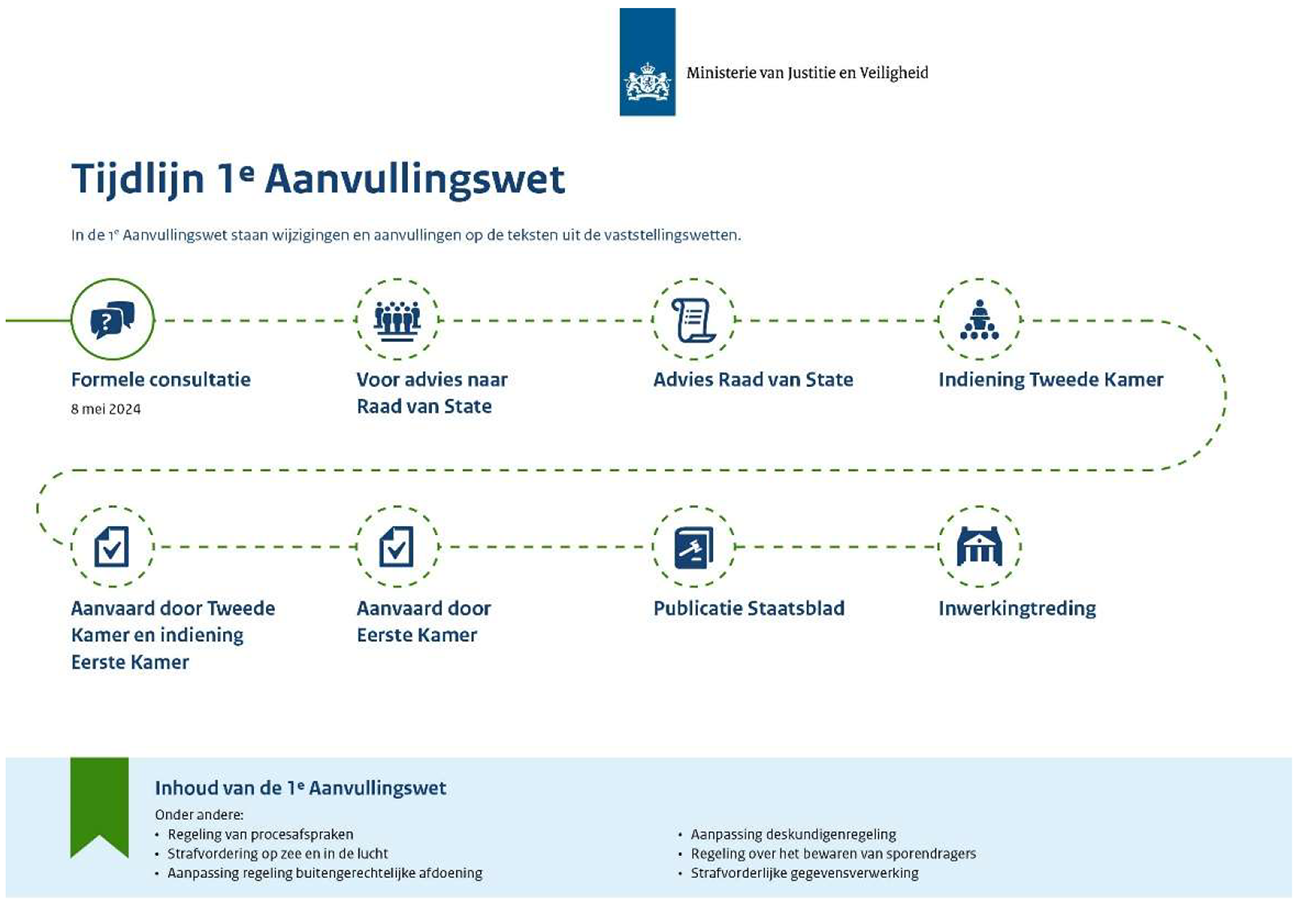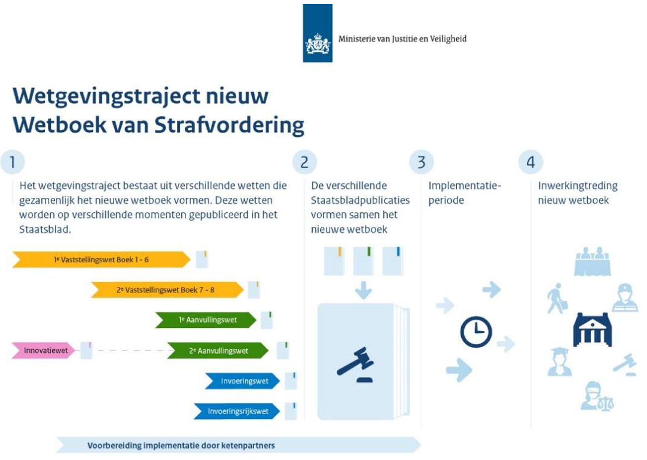 Sinds 2014 wordt gewerkt aan de totstandkoming van een nieuw Wetboek van Strafvordering. Zoals in het regeerprogramma benoemd, ziet het kabinet het nieuwe wetboek als nieuwe wetgeving ten behoeve van de nationale veiligheid en voert het kabinet actief regie voert op alle noodzakelijke voorbereidingen van de betrokken organisaties met het oog op de geplande inwerkingtreding van dit nieuwe wetboek in april 2029.