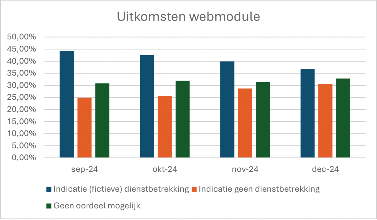 Uit deze cijfers blijkt dat het aandeel «indicaties dat er mogelijk sprake is van een (fictieve) dienstbetrekking» maandelijks afneemt (van 44,3% in september 2024 tot 36,7% in december 2024). Tegelijkertijd is het aandeel «indicatie geen dienstbetrekking» toegenomen (van 24,9% in september 2024 tot 30,5% in december 2024). Ook is het aandeel «geen oordeel mogelijk» lichtelijk gestegen (van 30,8% in september 2024 tot 32,8% in december 2024).