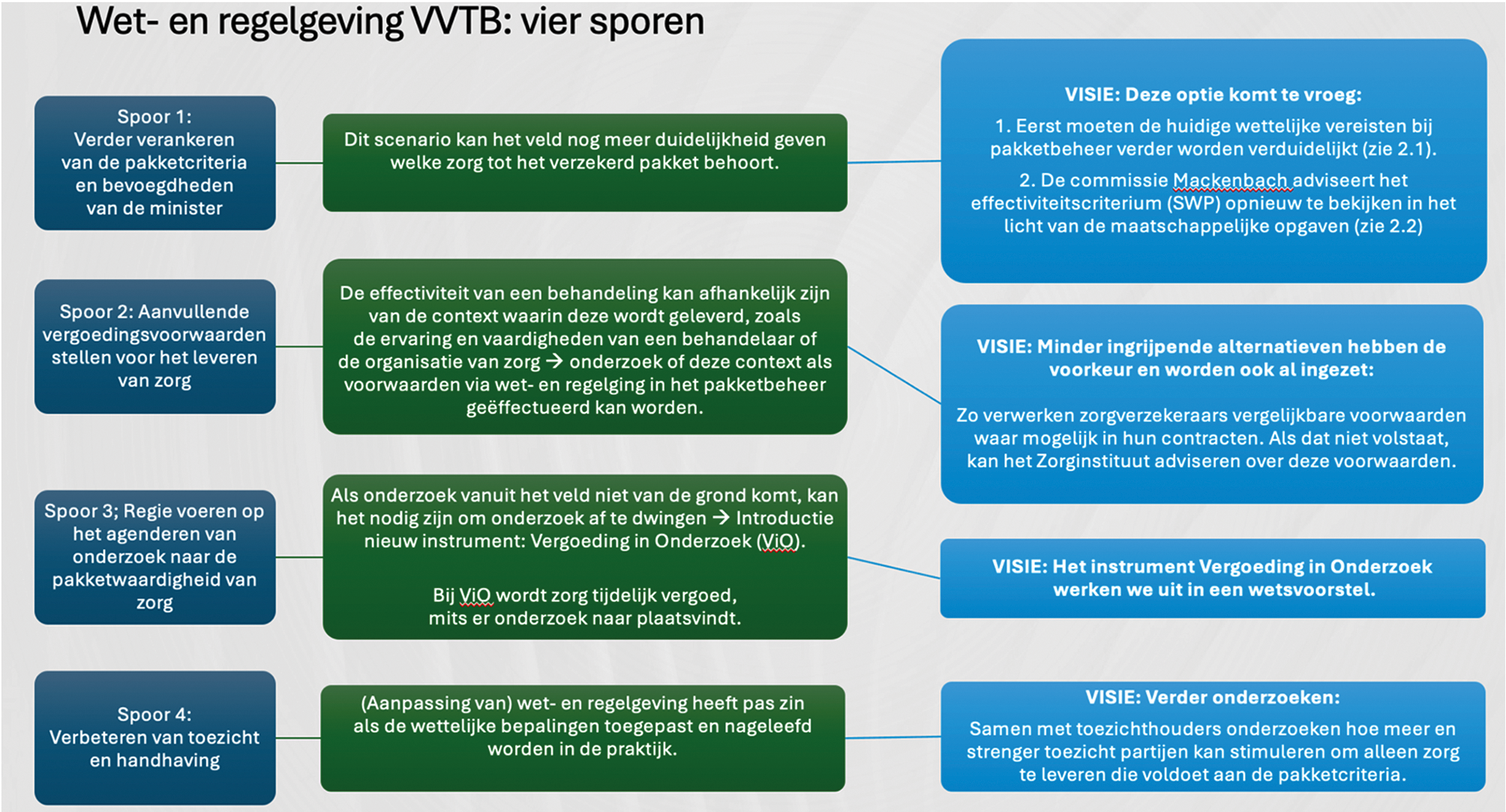 In eerdergenoemde VVT-brief van juni 2024 is aangekondigd te onderzoeken of en hoe ik wet- en regelgeving rond pakketbeheer kan verstevigen zodat de wettelijk verantwoordelijke partijen, het Zorginstituut en VWS, hun rol beter kunnen uitvoeren. Er zijn toen drie sporen geschetst om verder te onderzoeken. Daar ben ik mee aan de slag gegaan. Daarnaast heb ik daar nog een vierde spoor aan toegevoegd, het verbeteren van toezicht en handhaving. Dit zijn de sporen: